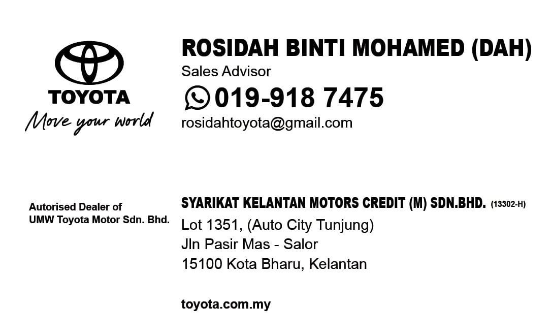 Hai! Nama saya Puan Rosidah, Sales Advisor Toyota Kelantan yang sah dan berpengalaman lebih 22 tahun dalam bidang jualan kereta di Malaysia.